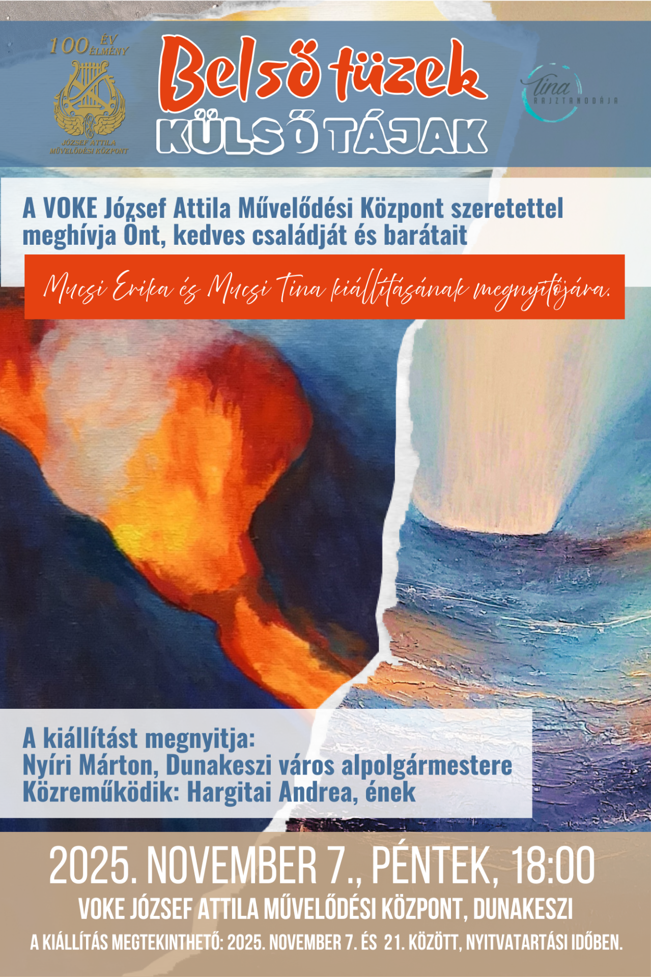 A VOKE József Attila Művelődési Központ szeretettel meghívja Önt, kedves családját és barátjait 2025 november 7-én pénteken 18 órára, Mucsi Erika és Mucsi Tina Belső tüzek - Külső tájak című kiállításának megnyitójára.